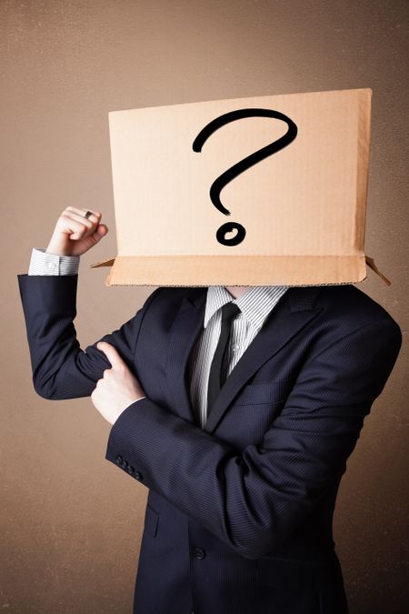 Businessman standing and gesturing with a cardboard box on his head with question mark