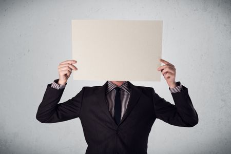 Businessman standing and holding in front of his head a white paper with copy space