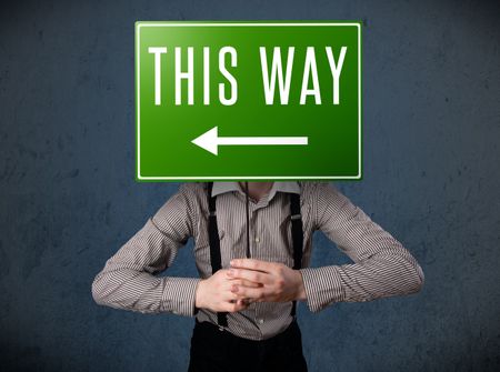 Businessman standing and holding a green direction sign in front of his head