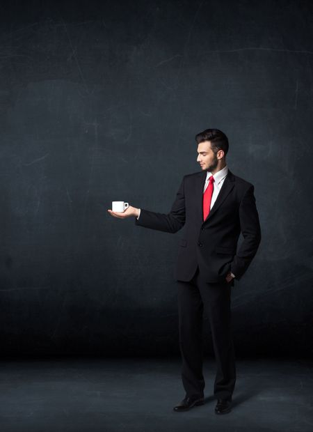 Businessman standing and holding a white cup on a black background
