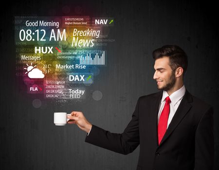 Businessman standing and holding a white cup with daily news and information coming out of the cup