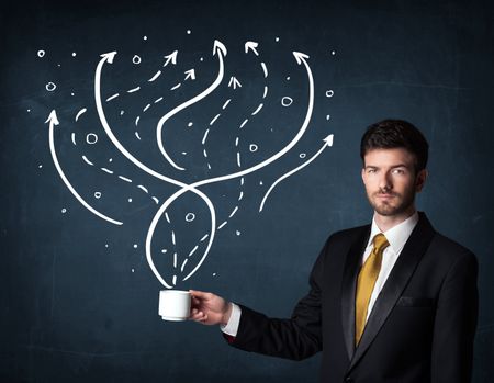 Businessman standing and holding a white cup with drawn lines and arrows coming out of the cup