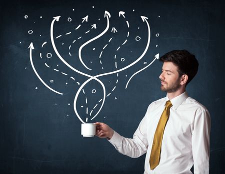 Businessman standing and holding a white cup with drawn lines and arrows coming out of the cup