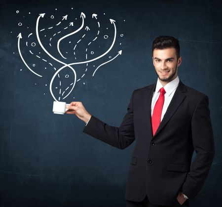 Businessman standing and holding a white cup with drawn lines and arrows coming out of the cup