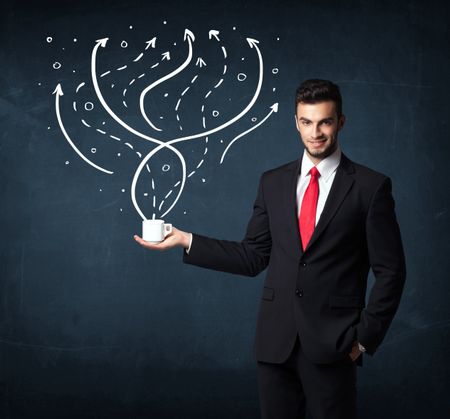 Businessman standing and holding a white cup with drawn lines and arrows coming out of the cup