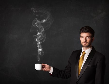 Businessman standing and holding a white steamy cup on a black background