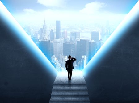 Businessman standing in the prison and looking at the cityscape