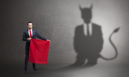 Businessman standing with red cloth in his hand and devil shadow on the background