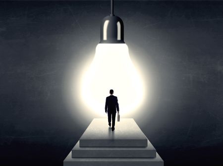Businessman standing on a step in front of a huge light bulb, concept of having an idea.