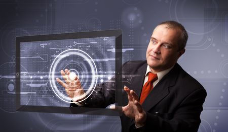 Businessman standing and touching modern technology tablet