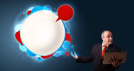 Businessman in suit holding a laptop and presenting abstract modern speech bubble with copy space