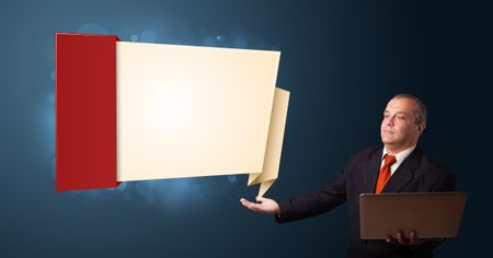 Businessman in suit holding a laptop and presenting modern origami copy space