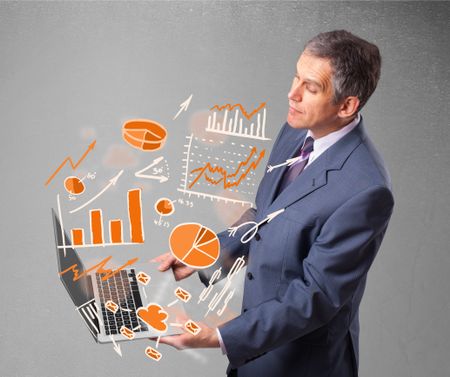 Businessman in suit holding notebook with graphs and statistics