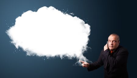 Businessman in suit making phone call and presenting abstract cloud copy space