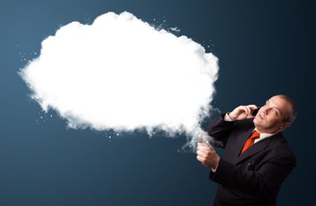 Businessman in suit making phone call and presenting abstract cloud copy space