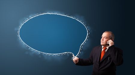 businessman in suit making phone call and presenting speech bubble copy space