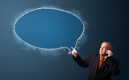 businessman in suit making phone call and presenting speech bubble copy space