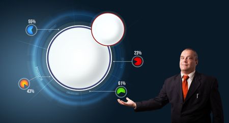 businessman in suit presenting abstract modern pie chart with copy space
