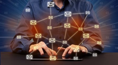 Businessman in suit typing with connected mail icons around