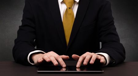 Businessman in suit typing with dark background