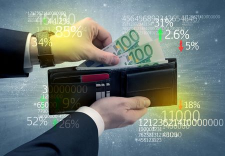 Businessman and takes out euro from wallet with stock exchange theme