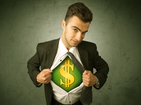 Businessman tearing off his shirt with dollar sign on chest concept on background