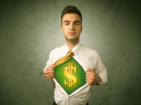 Businessman tearing off his shirt with dollar sign on chest concept on background