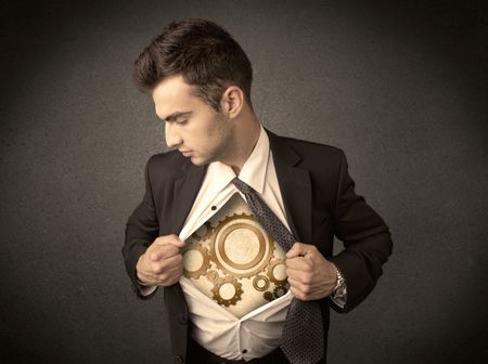 Businessman tearing shirt off and machine cog wheel shows on his chest concept on background