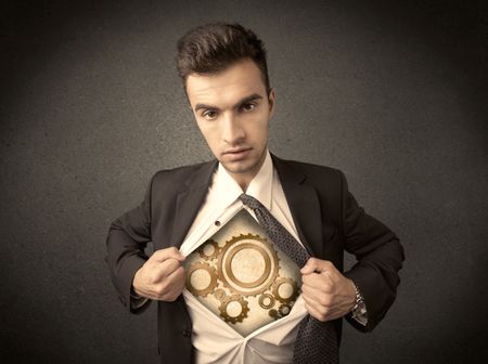 Businessman tearing shirt off and machine cog wheel shows on his chest concept on background