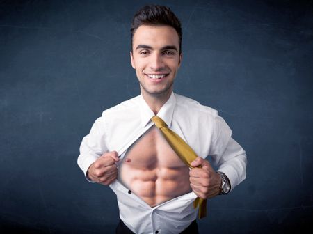 Businessman tearing off his shirt and showing mucular body concept on background