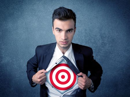 Businessman tearing his shirt off with target sign symbol on his chest concept on background