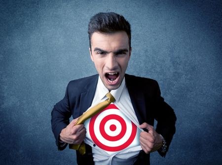 Businessman tearing his shirt off with target sign symbol on his chest concept on background