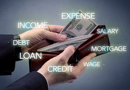 Businessman's hand takes out dollar from wallet with bank keywording wallpaper