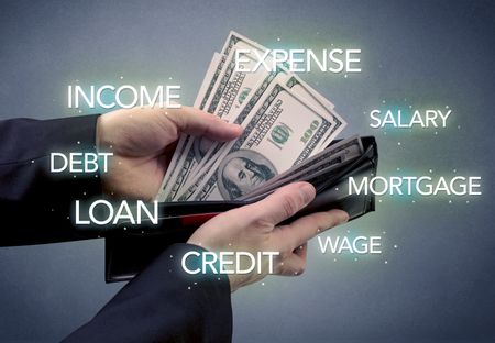 Businessman's hand takes out dollar from wallet with bank keywording wallpaper