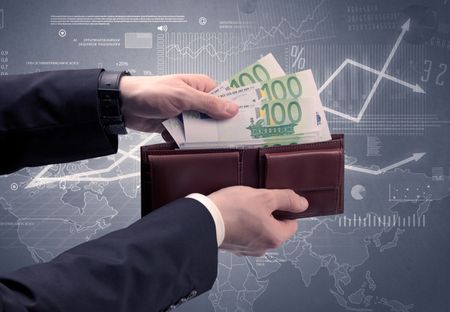 Businessman's hand takes out dollar from wallet with finance graphic on the background