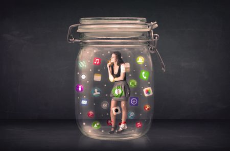 Businesswoman captured in a glass jar with colourful app icons concept on background