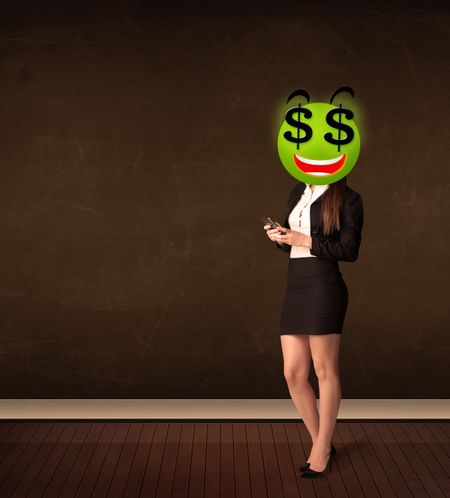 Businesswoman with dollar sign smiley face