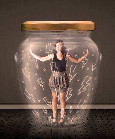 Businesswoman inside a glass jar with lightning drawings concept on background