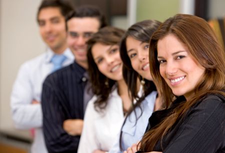 businesswoman leading a business team in an office smiling