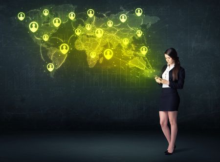 Businesswoman in office with tablet and social network world map concept on background