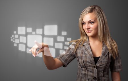 Businesswoman pressing high tech type of modern buttons on a virtual background