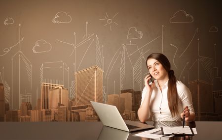 Businesswoman sitting at the black table with buildings and measurements on the background