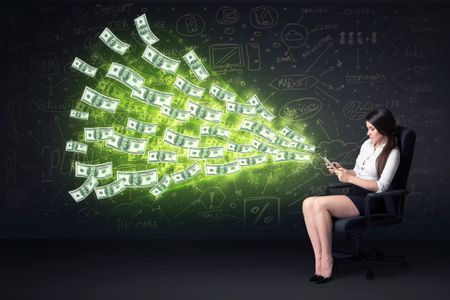 Businesswoman sitting in chair holding tablet with dollar bills coming out concept on background