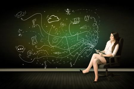 Businesswoman sitting in chair holding tablet with media icons concept on background