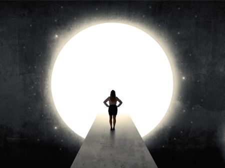 businesswoman standing in front of the huge circle gate