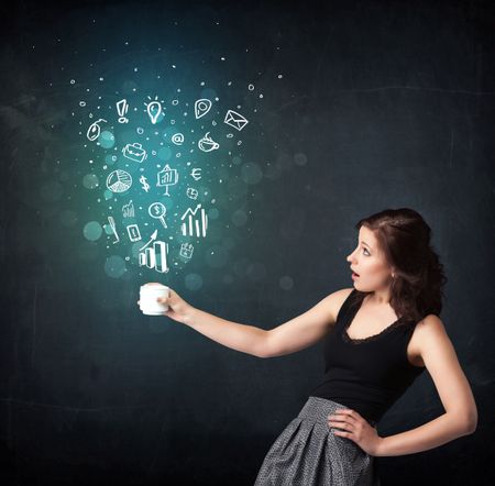 Businesswoman standing and holding a white cup with business icons coming out of the cup