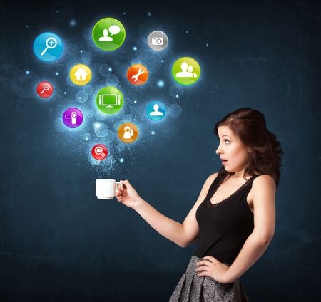 Businesswoman standing and holding a white cup with colorful setting icons coming out of the cup