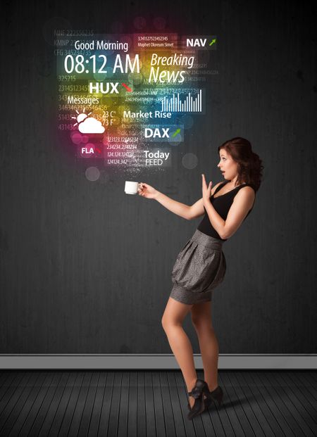 Businesswoman standing and holding a white cup with daily news and information coming out of the cup