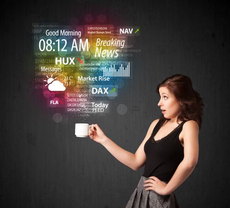 Businesswoman standing and holding a white cup with daily news and information coming out of the cup