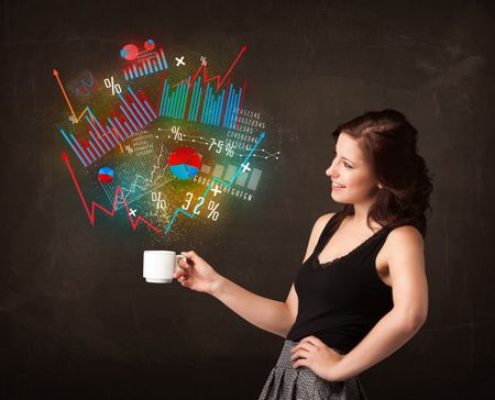 Businesswoman standing and holding a white cup with diagrams and graphs coming out of the cup